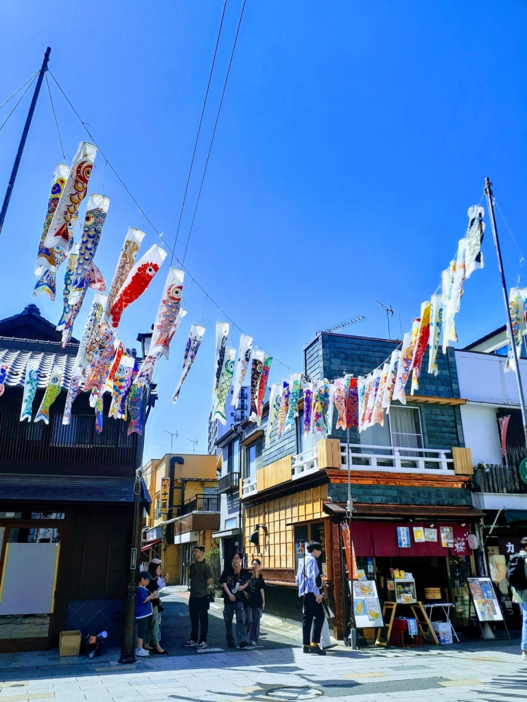 天気の良いある日川越の大正浪漫通りを通りがかったら、鯉のぼりがずらーっと並んでおりました。 川越春の風物詩「およげ鯉のぼくん」です。 色とりどりの鯉のぼりが青空に映えて、とても華やかでした。 散策される観光の方が沢山いらして写真を撮っていました。 食べ歩きも楽しめます。 過ごしやすい今、ぜひ川越観光を楽しんでいただきたいと思います。