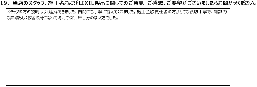 ♩今回は当店をお選びいただきありがとうございました。またお褒めの言葉をいただき大変うれしく思います。今回お選びいただいた理由の大きなポイントとして、お問い合わせ時にはわからなかった「ご両親がお住まいになられる」事に対する初期プランを作れたことが大きかったのではないかと思います。よく話に出る『ユニバーサルプラン』を念頭に初期プランをご提案させていただいたのですが、お打ち合わせに入る際にお話いただいた細かなご希望内容もそのプランで解決できていた事も大きな要因になったと思います。エコキレは「お住まいになられるこれからの時間」を大事に提案、工事を行い、工事完了後も長くお付き合いいただけるようアフターサービスをご案内しております。今後も気になる事があったらいつでもご連絡ください♪