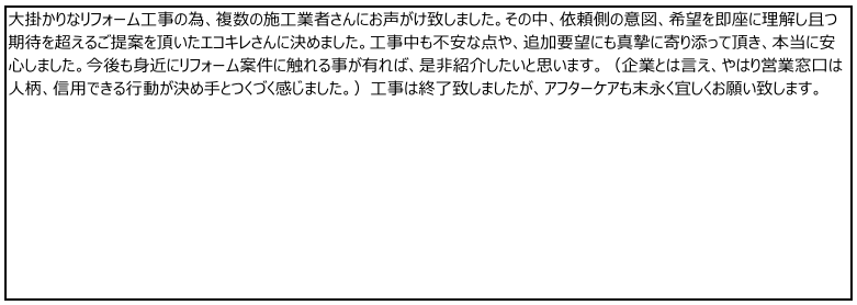 ♩この度は当店のご利用ありがとうございました。また大変高い評価をいただき誠にありがとうございます。4月初めにLIXILショールームから紹介いただきました。その際「信頼できるお店です」という口添えがあったそうです。今回のリフォームについては事情があり、ご希望に沿うには構造的な制約があり、柱を1本ずらす必要が出てきた事、また工事前はタイル浴室で自由な設計となっていた為、ユニットバス化した時に窓が浴槽の高さより低い位置に来てしまう事など情報を整理し可能か不可能かを判断する必要がありました。競合した他社さん皆さんは「不可」という判断だったと伺いましたが、当店は設計士の先生と図面の確認を行い施工可能であると判断できたところがお客様がお選び下さったポイントになったと思います。大きな工事だったので細かな修正は発生してしまいましたが、お客様の寛大な心に助けられ無事完成出来ました。今回の工事で信用を頂けたことで、お知り合いの方へも紹介いただけることになっています。お客様の期待に応えられるようエコキレはこれからも頑張ってまいります♪